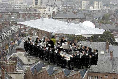 Meja terbang ini memiliki 22 kursi dan diangkat dengan crane seberat 200 ton. Dapat dipesan oleh satu pesta selama satu jam, dan pemesannya akan mendapatkan fasilitas koki, pelayan, dan fotografer yang akan mendokumentasikan pengalaman mereka.