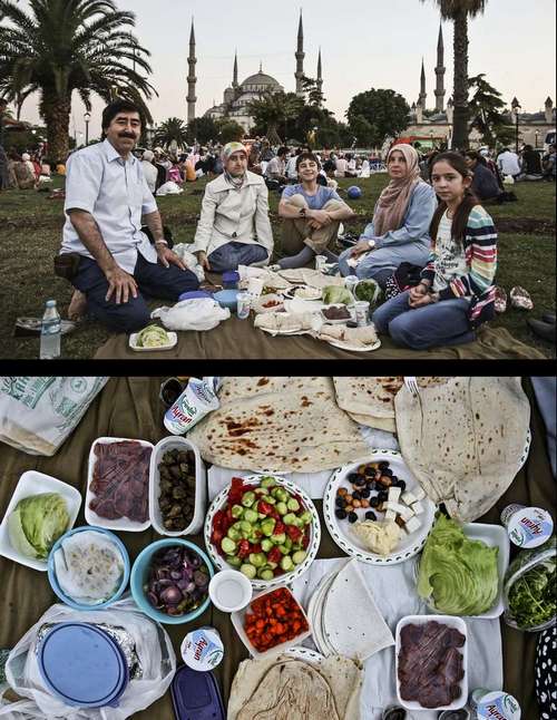 Foto ini menunjukkan sebuah keluarga muslim yang menunggu untuk berbuka puasa pada bulan suci Ramadan di Istanbul, Turki. Masjid Sultan Ahmed, Istanbul, terlihat di belakang mereka.