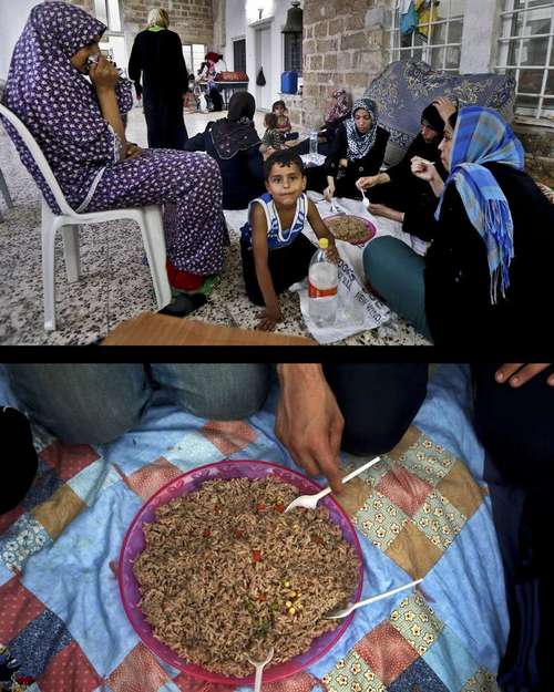 Kesederhanaan yang bernilai mahal. Meski menu mereka seadanya, namun kebersamaan mereka adalah hal yang tidak biasa. Sebuah keluarga muslim Palestina sedang akan berbuka puasa di bulan Ramadan dengan makanan yang terdiri dari sepiring nasi goreng. Buka puasa tersebut dilakukan di Gereja St. Porphyrios. Mereka adalah orang-orang yang mengungsi.
