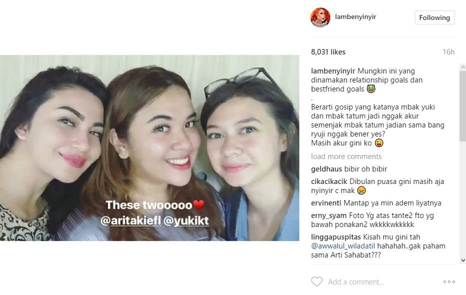 Dalam postingan itu, ketiganya nampak kompak tersenyum lebar ke arah kamera. Ekspresi gemas sambil unjuk gigi pun mereka pamerkan. "These twooooo @aritakiefl @yukikt," tulis Ariel dalam keterangan postingannya sambil menyisipkan tanda hati.