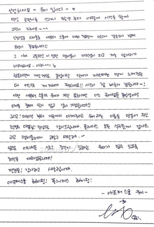 "Halo, ini Uee! Sulit sekali rasanya bagiku untuk menuliskan apa yang ingin kusampaikan. Rasanya baru kemarin aku melakukan debut sebagai member After School, tapi ternyata 8 tahun telah berlalu. Selama itu pula para member bertumbuh mulai dari anak sekolahan, kemudian naik menjadi mahasiswi. Bahkan aku pun mengganti pekerjaanku jadi seorang aktris... haha," tulis Uee dalam surat tulisan tangan tersebut. "Dengan adanya sistem kelulusan di After School, aku selalu merasa bahwa hal itu masih terlalu jauh untukku. Namun, tiba-tiba sudah tiba waktuku untuk lulus. Waktu berjalan cepat sekali!"