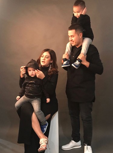 Setelah berbagai pose, Sissy memilih berpose sambil memangku Kairo, dan Rifat menggendong Mayka.