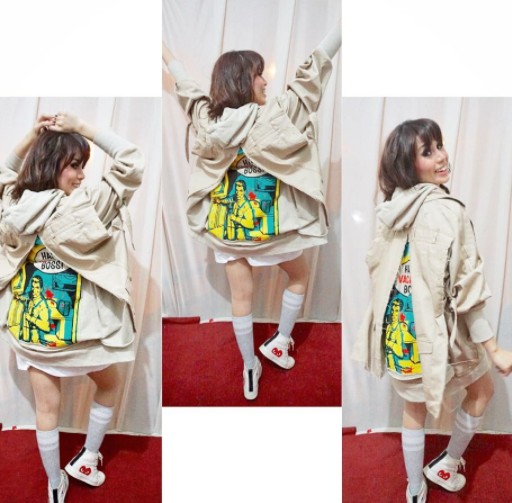 Mengenakan kaus kaki, Momo tampil chic dan terlihat muda dalam balutan jaket parka dengan gambar kartun di bagian belakang.