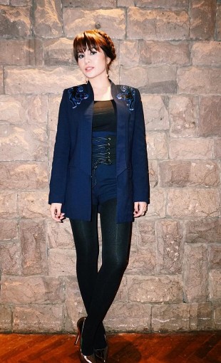 Berblazer biru dan rambut yang digelung, Momo nampak elegan dengan perpaduan warna-warna gelap.