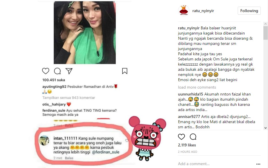 Hal itu berawal saat Sule memberikan komentar pada salah satu foto Ayu. Dalam foto itu, Ayu sedang berpose dengan Zaskia Gotik. "Ayu sehat TING TING kemana? Semoga masih ada ya," tulis Sule dalam kolom komentar postingan Ayu.