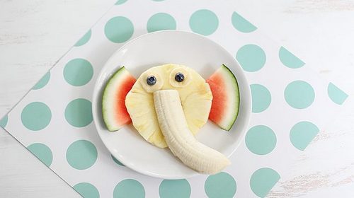 Penataan: Tata irisan semangka ke piring untuk membentuk telinga dan kemudian atur kepingan nanas untuk membentuk kepala. Tempatkan salah satu bagian pisang di tengah nanas untuk membentuk belalai. Kemudian masukkan dua irisan pisang di atas batang atasnya dengan dua buah blueberry untuk membentuk mata.