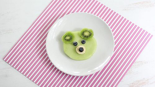 Penataan: Tempatkan melon madu ke piring untuk membentuk kepala, lalu atur dua buah kiwi di bagian atas untuk membentuk telinga. Letakkan potongan pisang di tengah melon yang di atasnya dengan blueberry untuk membentuk hidung. Taruh dua blueberry di atas hidung untuk membentuk mata.