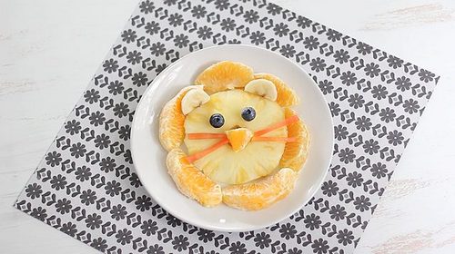 Penataan: Atur kepingan nanas di piring untuk membentuk kepala lalu letakkan bagian jeruk di sekitarnya untuk membentuk bulu singa. Letakkan dua irisan pisang setengah di bagian atas kepala untuk membentuk telinga. Tempatkan bagian jeruk segitiga di tengah nanas untuk membentuk hidung, dan atur dua buah blueberry di atasnya untuk membentuk mata. Tetapkan dua potongan korek api semangka di kedua sisi hidung untuk membentuk kumis.