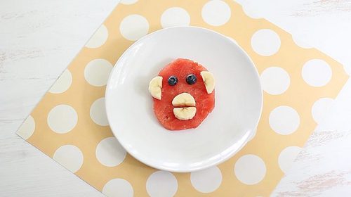 Penataan: Tata semangka ke piring untuk membentuk kepala. Tempatkan potongan setengah pisang (vertikal) pada kedua sisi kepala untuk membentuk telinga. Masukkan dua irisan pisang lainnya (secara horisontal) di bagian bawah kepala untuk membentuk mulut. Tempatkan dua blueberry di atas mulut untuk membentuk mata.