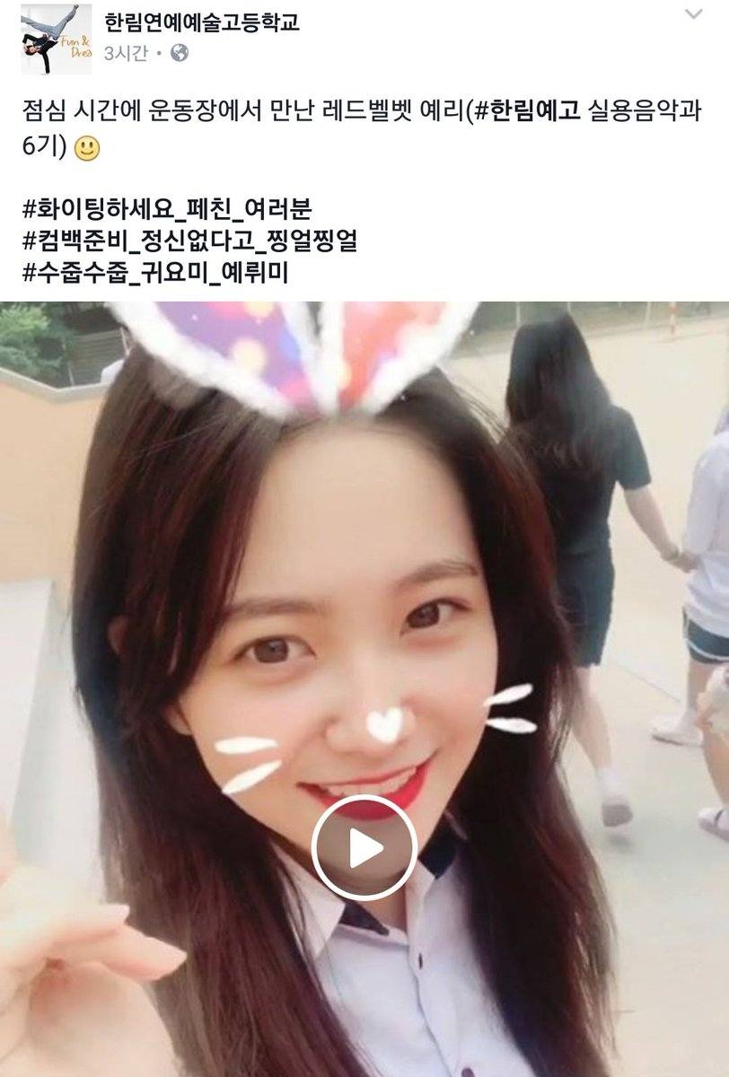 Caption dari postingan itu menyatakan, "Bertemu dengan Yeri Red Velvet di halaman sekolah saat makan siangHanlim kelas musik praktis 6). #FacebookFriendsFighting #Preparing for a Comeback_Losing my Mind_Whines #Shy but Cute Yerim."