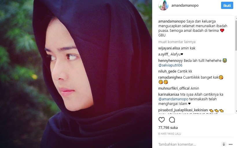 Mengenakan hijab dan dipotret dari samping, Amanda Manopo juga mendoakan agar ibadah puasa umat muslim dapat diterima oleh Allah.