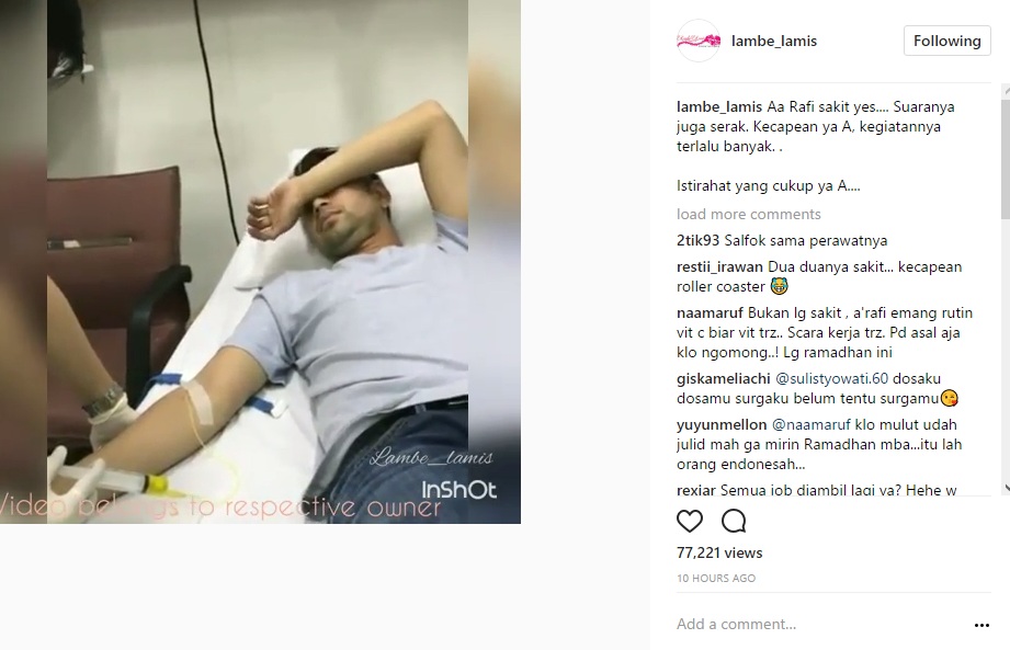 Hal tersebut diketahui melalui postingan akun gosip @lambe_lamis. Melalui sebuah rekaman video, Raffi terbaring lemah di ranjang pasien. Bahkan, suara Raffi juga terdengar serak. "Aa Rafi sakit yes.... Suaranya juga serak. Kecapean ya A, kegiatannya terlalu banyak. ." tulis akun gosip itu melalui caption postingannya.