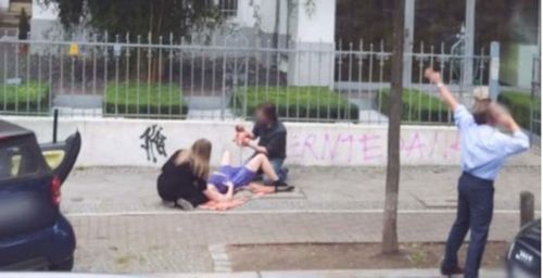 Seorang wanita melahirkan di trotoar pinggir jalan. Terlihat dua orang membantu proses persalinan wanita itu. Salah satu orang di antaranya sudah memegang bayi wanita itu.