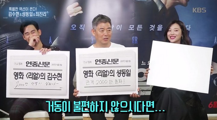 Kanal247.com - Jumat, 2 Juni, Kim Soo Hyun, Sung Dong Il, Sulli tampil sebagai bintang tamu dalam acara KBS "Entertainment Weekly". Dalam kesempatan itu, mereka mengungkapkan tentang headline seperti apa yang ketiganya harapkan dari berita tentang film "Real" nantinya.