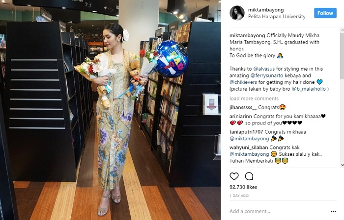 Melalui postingan di Instagram pribadinya, ia mengungkapkan kebahagiannya. "Officially Maudy Mikha Maria Tambayong, S.H., graduated with honor. To God be the glory," tulis Mikha dalam caption fotonya.