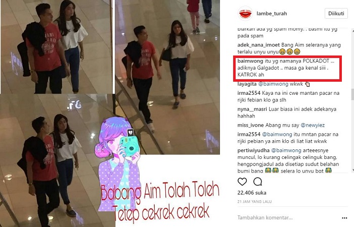 Secara mengejutkan, Baim pun menyebutkan nama teman wanitanya itu. "itu yg namanya POLKADOT ... adiknya Galgadot .. masa ga kenal siii . KATROK ah," katanya dengan bercanda.