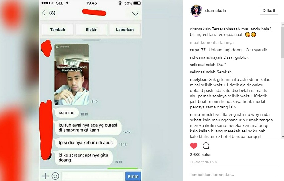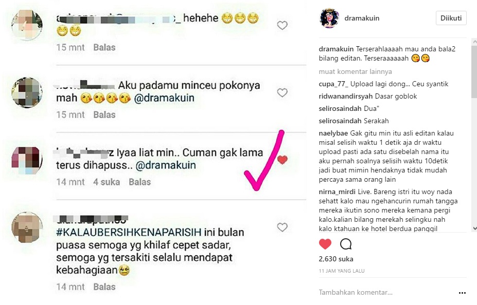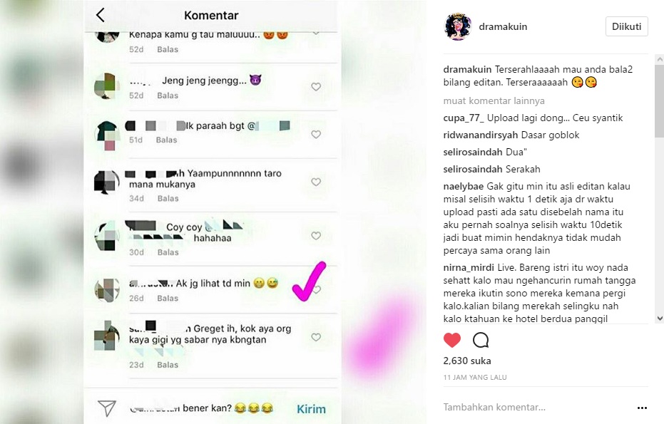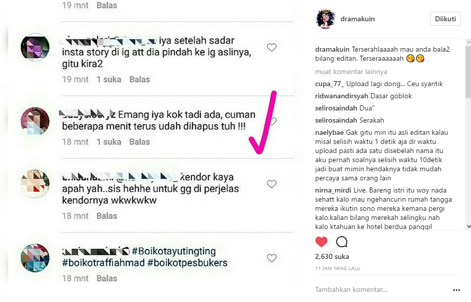 Tak sedikit yang menyebut postingan itu hanyalah editan. "fans nyonya gimana sii malah mau ngancurin rumah tangga idolanya aneh yg ada fans itu kagak ky gtu eeh ini malah sengaja d edit2 biar hobaaaaah," ujar netizen. "Klo ngedit kurang Pinter boy hhhhhh @dramakuin," ujar lainnya.