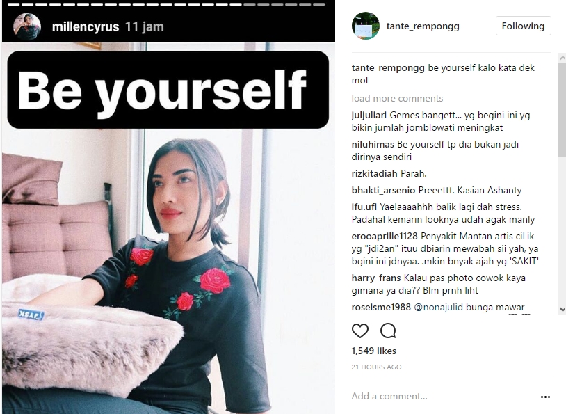 Rupanya, Millen masih nyaman dengan pakaian dan gaya layaknya wanita itu. Millen bahkan memberikan keterangan di postingannya seolah menegaskan bahwa ia telah menjadi diri sendiri. "Be yourself," tulis Millen.