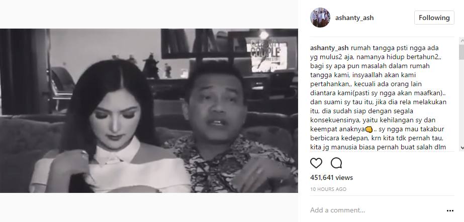 Meskipun demikian, Ashanty mengakui jika dalam rumah tangganya pasti ada masalah. Namun, ia dan sang suami tetap berusaha mempertahankan rumah tangganya itu. "rumah tangga psti ngga ada yg mulus2 aja, namanya hidup bertahun2,, bagi sy apa pun masalah dalam rumah tangga kami, insyaallah akan kami pertahankan,," tulis Ashanty dalam caption postingannya.