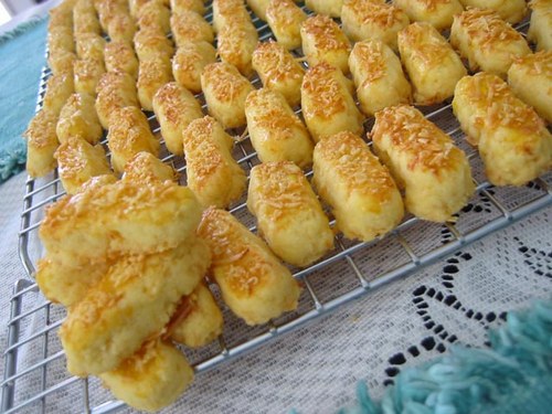 Biasanya panjang kue Kastengel tidak lebih dari 4 cm, dengan lebar 1 cm. Untuk menambah cita rasa keju lebih 'ngena', kue ini ditaburi parutan keju di permukaannya. Rasanya? sangat gurih dan enak banget.