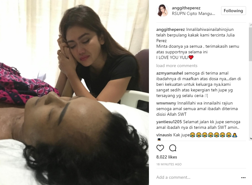 Dalam postingan yang diunggah di akun Instagram pribadinya, @anggitheperez, Nia terlihat sangat terpukul dengan kepergian sang kakak. Sambil menggenggam tangan sang kakak, Nia pun tak kuasa menahan air matanya. "Innalilahiwainailahirojiun telah berpulang kakak kami tercinta Julia Perez," tulis Nia dalam caption postingannya belum lama ini.