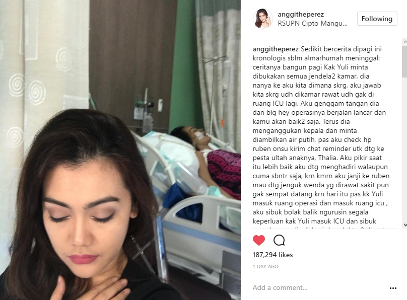 Pagi sebelum meninggal, Jupe sempat meminta Nia untuk membuka seluruh jendela kamar inapnya. "Sedikit bercerita dipagi ini kronologis sblm almarhumah meninggal: ceritanya bangun pagi Kak Yuli minta dibukakan semua jendela2 kamar," tulis Nia dalam caption postingannya.