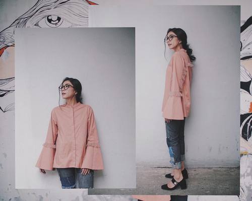 Kamu bisa tampil kasual di hari lebaran dengan mengenakan frill blouse berwarna cerah. Padukan dengan patch jeans yang bikin penampilanmu makin kece.