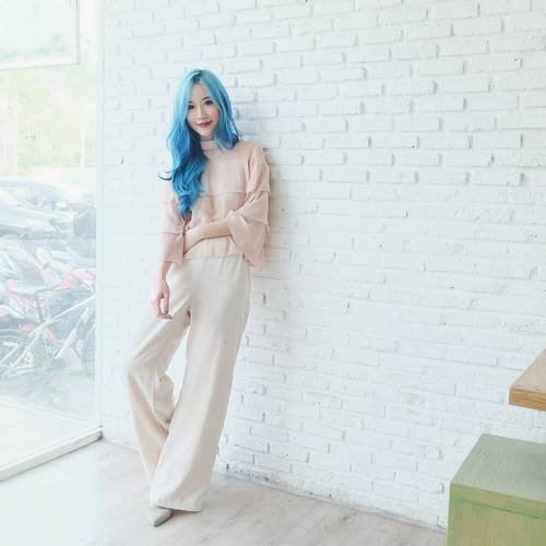 Pilih celana palazzo dengan warna kalem seperti khaki atau warna krem, lalu padukan dengan atasan warna pastel supaya kulit terlihat lebih cerah.