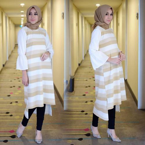 Pilih tunik bermotif garis-garis berwarna kalem seperti cokelat susu misalnya, dan padukan dengan kerudung warna senada. Untuk bawahan kamu bisa memilih skinny jeans warna hitam