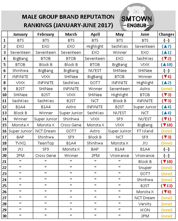 Lembaga Penelitian Bisnis Korea melihat interaksi, liputan media, komunikasi, dan indeks komunitas melalui 81.521.300 data besar yang dihimpun dari tanggal 9 sampai 10 Juni untuk menganalisis reputasi brand dari boyband K-Pop. Banyaknya data yang dianalisis oleh Lembaga Penelitian Bisnis Korea mengalami peningkatan sebanyak 26,47% dari 64.460.090 lembar data besar yang dianalisis untuk peringkat bulan Mei.