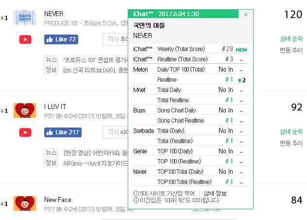 Tidak hanya mendapatkan penghargaan popularitas dari chart mingguan MelOn. Tim "Never" juga sukses meraih penghargaan "All-kill" pada tanggal 5 Juni lalu. Lagu yang dibuat oleh Hui, E'dawn, dan Wooseok dari Pentagon itu rupanya telah merajai beberapa realtime chart seperti Melon, Mnet, Bugs, Soribada, Genie, dan Naver.
