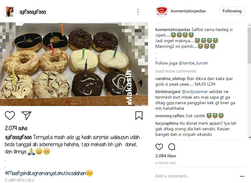 Sontak, tak sedikit netizen yang melayangkan sindiran untuk Syifa. Bahkan, mereka menuding Syifa memberli donat itu dengan uangnya sendiri. "Itu beli sendiri paling mangkanya alasan gak ngetag segala," sindir netizen. "Paling donat beli sendiri wakakaa," timpal lainnya.