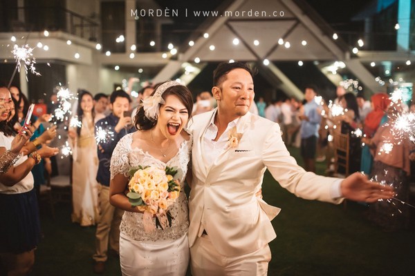 Bertema coral dan putih pasangan kocak ini memilih Pantai Batu Belik, Bali sebagai lokasi pernikahan mereka.