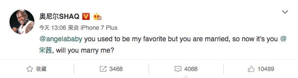 Selain itu, belum lama ini Shaquille O'Neal juga menuliskan lamarannya tersebut di akun Weibo pribadinya pada Kamis, 15 Juni 2017 silam. "Dulu Angela Baby adalah favoritku, tapi karena dia sudah menikah, sekarang kaulah favoritku, Victoria. Maukah kau menikah denganku?" tulis Shaquille O' Neal.
