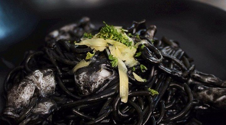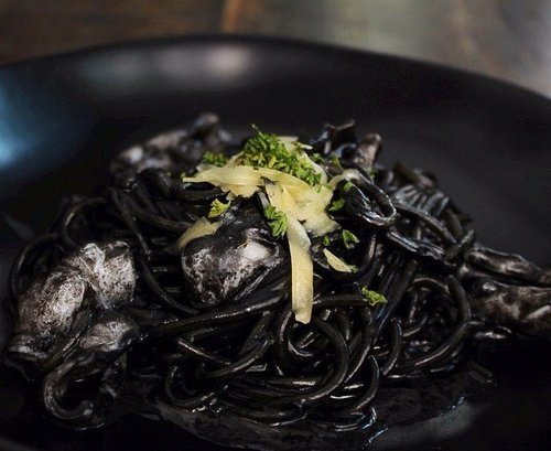 Sekilas bentuknya kayak cacing, tapi ini pasta enak buat dimakan. Disajikan di atas piring yang warnanya hitam juga dan menambah kesan 'dark', pasta ini diberi pelengkap potongan cumi yang empuk. Tinta cumi jadi bumbu utama pasta ini. Makanan ini dijual di sebuah bistro & bar di Jakarta.