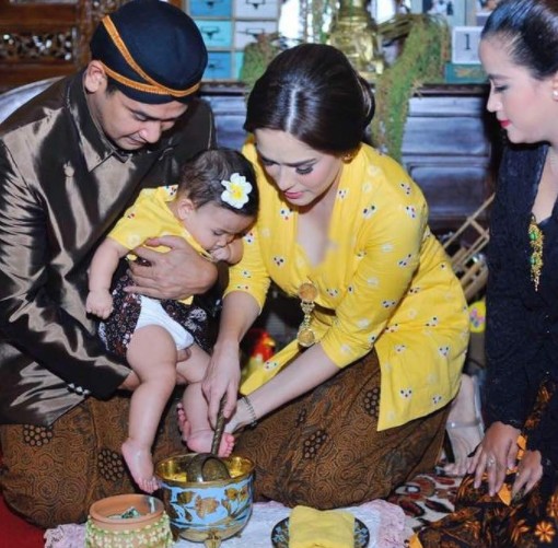 Baby Rose mengikuti prosesi Tedak Siten, salah satunya adalah membasuh kaki yang dilakukan kedua orang tuanya.