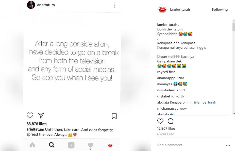 Kekasih Ryuji Utomo itu tak menjelaskan mengapa dirinya memutuskan untuk istirahat dari dunia yang telah membesarkan namanya. Ia pun hanya menyampaikan salam perpisahan dan berharap para pengikutnya di sosial media selalu menyebarkan cinta. "Until then, take care. And dont forget to spread the love. Always," tulis Ariel dalam caption postingannya.