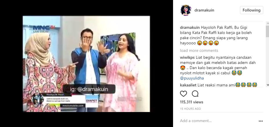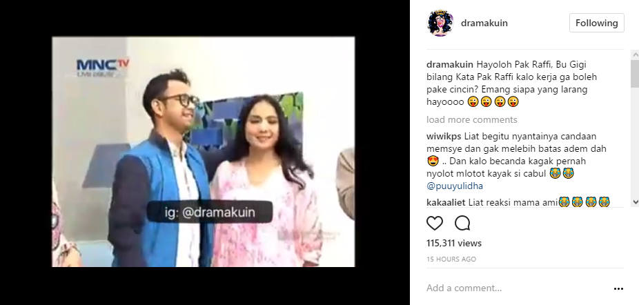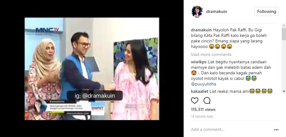 Gigi pun sedikit kesal dengan jawaban Raffi. "Oh gitu ya? Emang ada yang nggak ngebolehin kalo pake cincin itu ya? Dia bilang katanya nggak pake cincin kalo kerja nggak boleh pake cincin," sindir Gigi, sementara Raffi pun merangkul bahu istrinya itu.