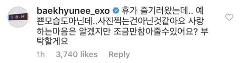 "Aku datang kemari untuk menikmati liburan... bahkan aku tidak terlihat ganteng saat ini... sehingga kupikir tidak seharusnya kalian mengambil foto," tulis Baekhyun di akun Instagram pribadinya. "Aku mengerti kalian sangat mencintai kami, tapi bisakah kalian sedikit menahan diri? Ini adalah permintaan dariku."