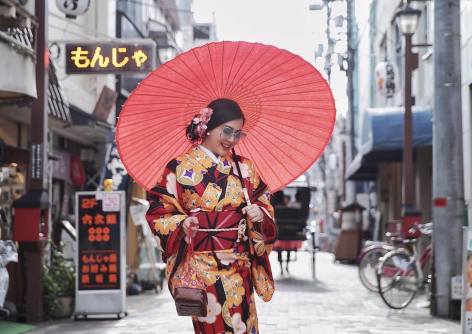 Selain bertemu Kim Kardashian, Syahrini menyempatkan diri untuk jalan-jalan di Asakusa, Tokyo sambil mengenakan kimono berwarna orange.