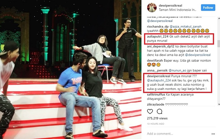 Mengetahui hal itu, Dewi Persik pun naik darah. "Punya mrunal ??? @auliaputri_224 sok tau lu, gw yg tau mrk, g usah buat resek disini, suka nonton g suka g usah nonton, sy lagi kerja faham !" jawab Depe.