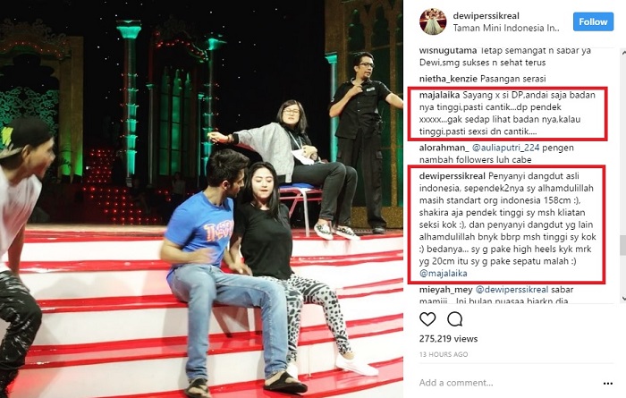Tak sampai disitu, Depe kembali geram saat dirinya disebut pendek. "Penyanyi dangdut asli indonesia, sependek2nya sy alhamdulillah masih standart org indonesia 158cm :), shakira aja pendek tinggi sy msh kliatan seksi kok :), dan penyanyi dangdut yg lain alhamdulillah bnyk bbrp msh tinggi sy kok :) bedanya... sy g pake high heels kyk mrk yg 20cm itu sy g pake sepatu malah :)," terang Depe.