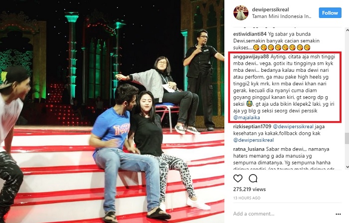 Bahkan, Angga membandingkan Depe dengan selebritis yang disebutkannya itu. "bedanya kalau mba dewi nari atau perform, ga mau pake high heels yg tinggi2 kyk mrk, krn mba dewi khan nari gerak, kecuali dia nyanyi cuma diam goyang pinggul kanan kiri, gt seorg dp g seksi, gt aja uda bikin klepek2 laki, yg iri aja yg blg g seksi seorg dewi perssik," lanjutnya.