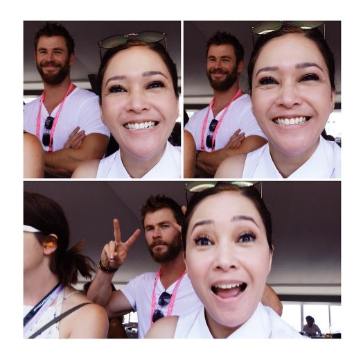 Ketika berlibur ke Monako belum lama ini Maia Estianty beruntung bisa berfoto selfie bersama bintang film "Thor", Chris Hemsworth.