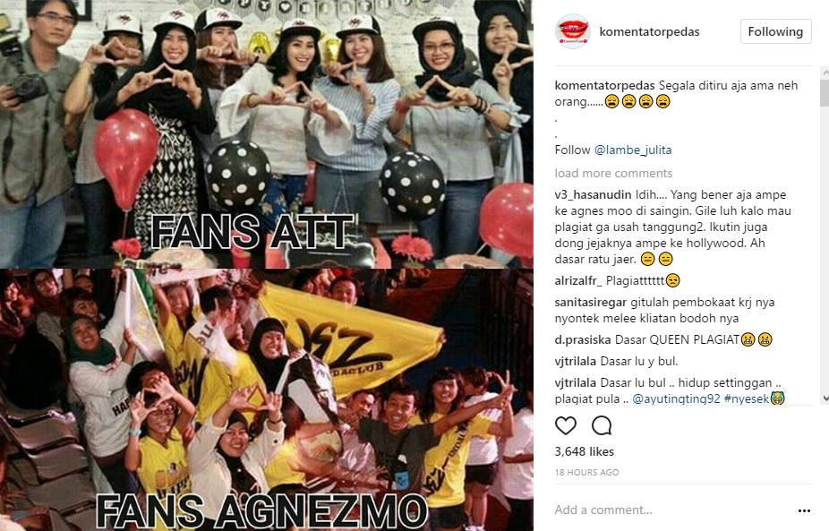 Mengetahui hal tersebut, tak sedikit netizen yang menyindir Ayu. "Aq udh ngira loh dr awal. A gt kan simbol fans agnes biasanya... aahh syudahlaahh...." sindir netizen. "dasar artis plagiat,beda jauh x dari Agnezmo," sindir lainnya. "itu @agnezmo udah lamaaaa banget dri jaman dia masih di indo fans ya kek gitu @ayutingting ngikutin aja eoh," timpal lainnya.