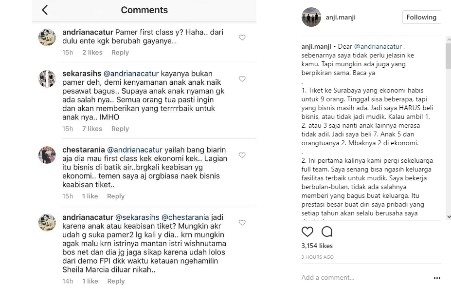 Menurutnya, ia memilih kelas bisnis lantaran tiket ekonomi telah habis. "Tiket ke Surabaya yang ekonomi habis untuk 9 orang. Tinggal sisa beberapa, tapi yang bisnis masih ada. Jadi saya HARUS beli bisnis, atau tidak jadi mudik. Kalau ambil 1, 2, atau 3 saja nanti anak lainnya merasa tidak adil. Jadi saya beli 7. Anak 5 dan orangtuanya 2. Mbaknya 2 di ekonomi," tulis Anji dalam caption postingannya.