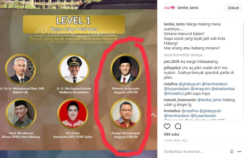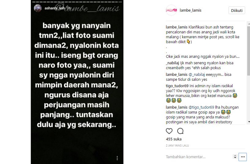 "Jadi walikota malang sepatutnya orang yang benar2 warga malang. Yang tau tentang malang. Wong asli malang. Bukanlah "pendatang" yang hanya sekedar invest rumah di malang atau buka bisnis di malang, kemudian ngaku2 orang malang. Hellowww, tau diri lah jadi orang klo mau nyalonkan diri," tulis okky_mirna.