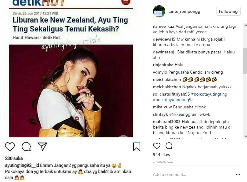 Mengetahui hal itu, tak sedikit netizen yang tetap menuding kekasih baru yang disebut seorang pengusaha itu adalah Raffi. "Pengusaha keripik King Kong sm chips taro," kata netizen. "mana ada yg mau sama si gundik @ayutingting92 dia aja dilepehin mulu.. si peak @raffinagita1717 doang tuh yg mau mungut..yg laen mah ogah lah sama dia.." kata lainnya.