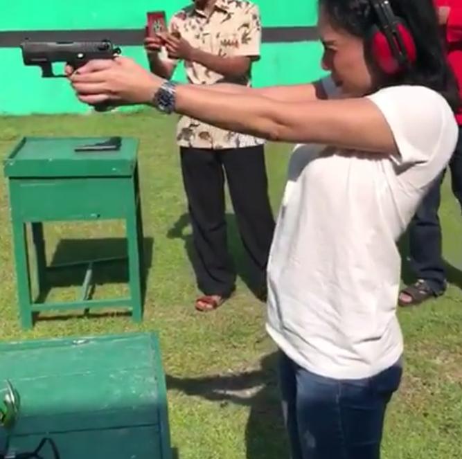 Begini gaya keren kakak kandung Krisdayanti tersebut saat fokus menembakkan peluru ke sasaran.