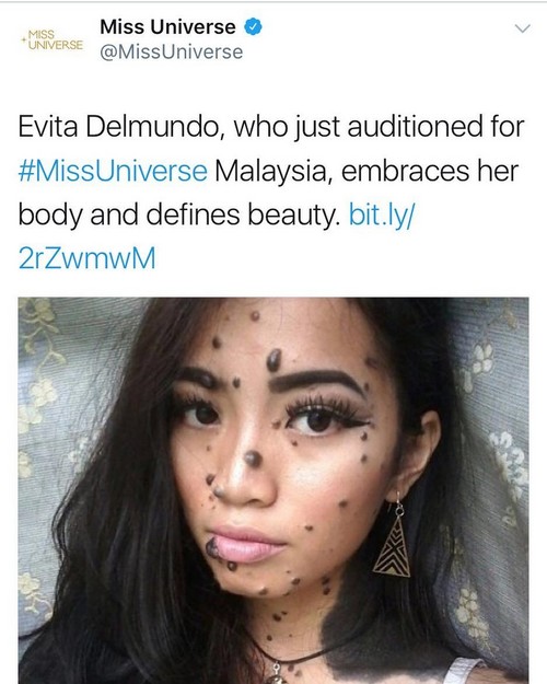 Evita Delmundo mendapat perhatian dan apresiasi dari beauty pageant 'Miss Universe', atas keberaniannya mengikuti ajang kecantikan Miss Universe Malaysia 2018. Hal ini disampaikan melalui twitter @MissUniverse: "Evita delmundo yang baru saja mengikuti audisi untuk Miss Universe Malaysia, telah merangkul tubuhnya dan mendefinisikan kecantikan."